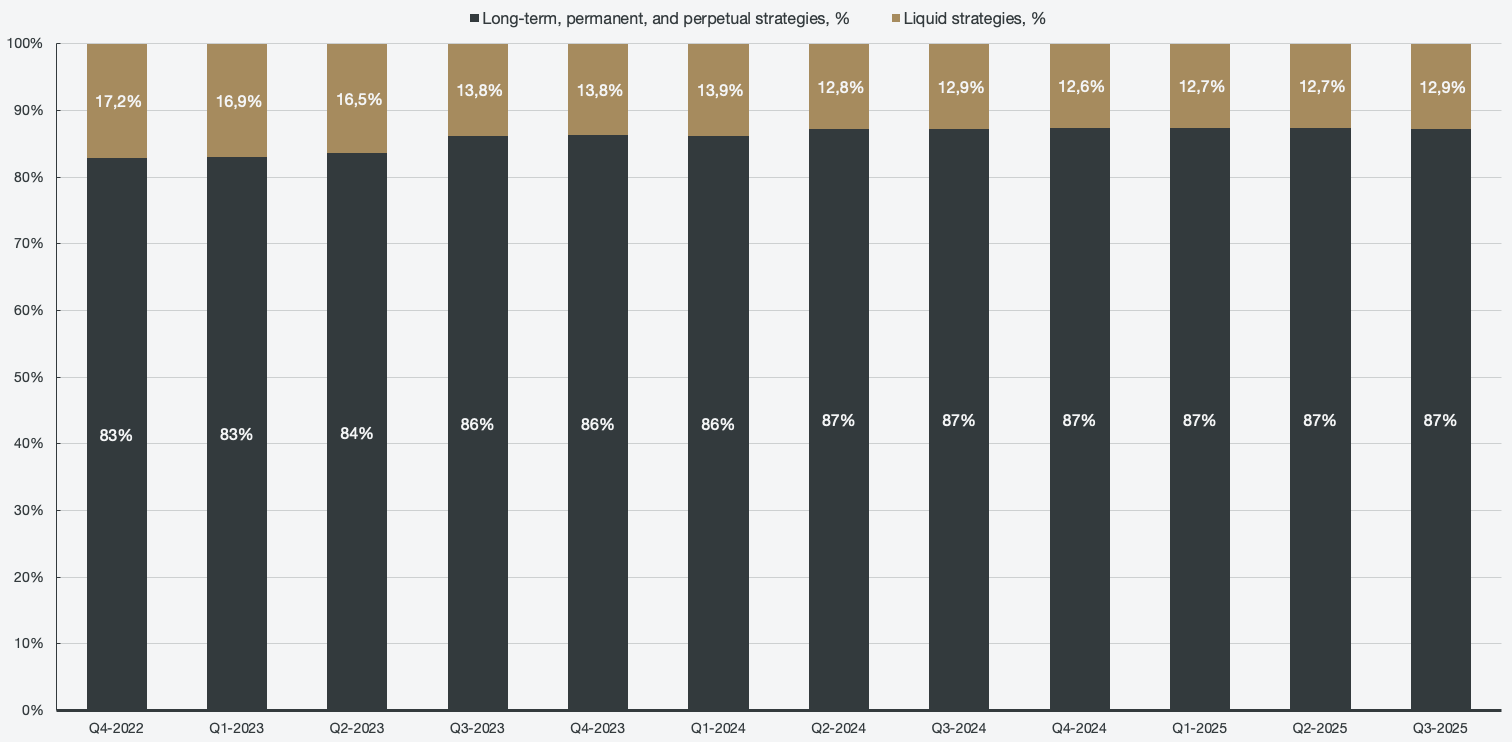As mentioned in my previous piece, Brookfield has the ambitious intention of roughly doubling the business by 2030. The core characteristics of the business makes financial performance largely predictable. These characteristics include a large majority of the fee-bearing capital being held for long-term, permanent, or perpetual capital. Only 13% of FBC is allocated to liquid strategies as of Q3 2025.