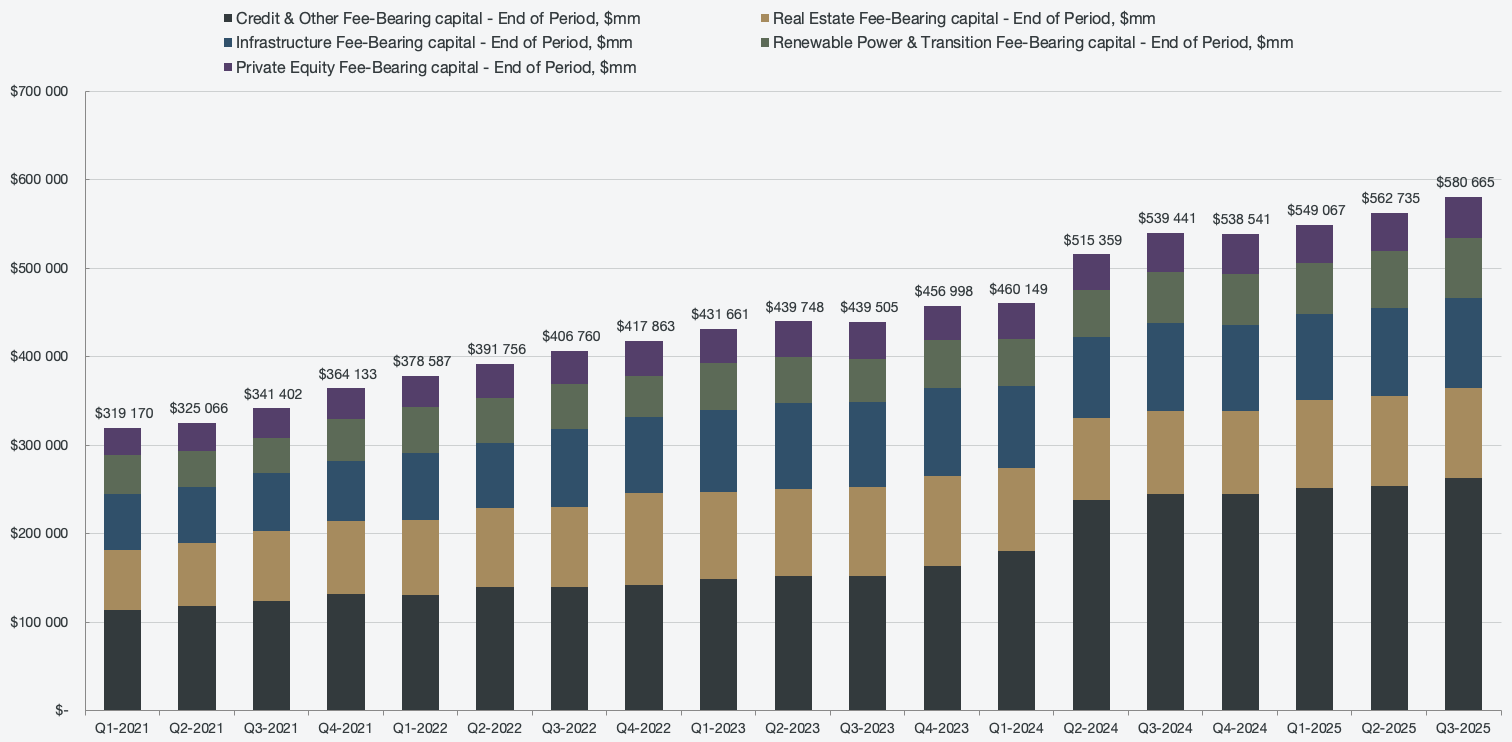 The most important metric to track for BAM is the total amount of fee-bearing capital, as not all AUM generates fees. The annualized net flows for the Q3 2025 period were 14.8%, with a net increase of $17,93 billion, an 8% increase Y/Y.