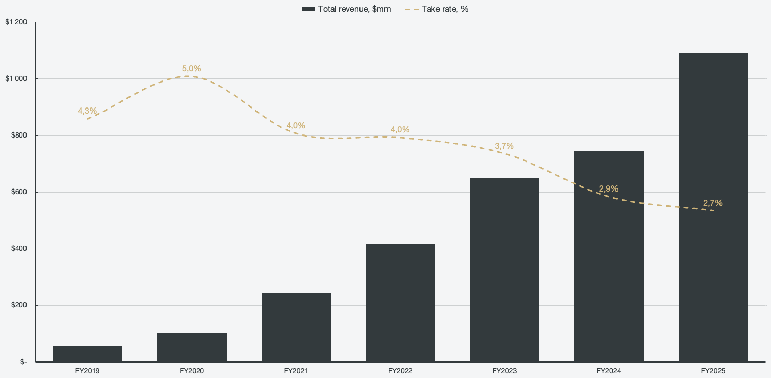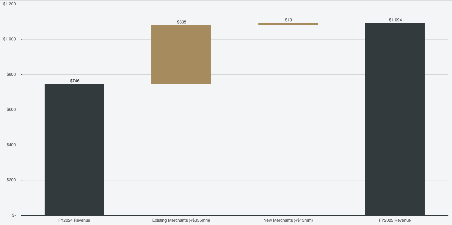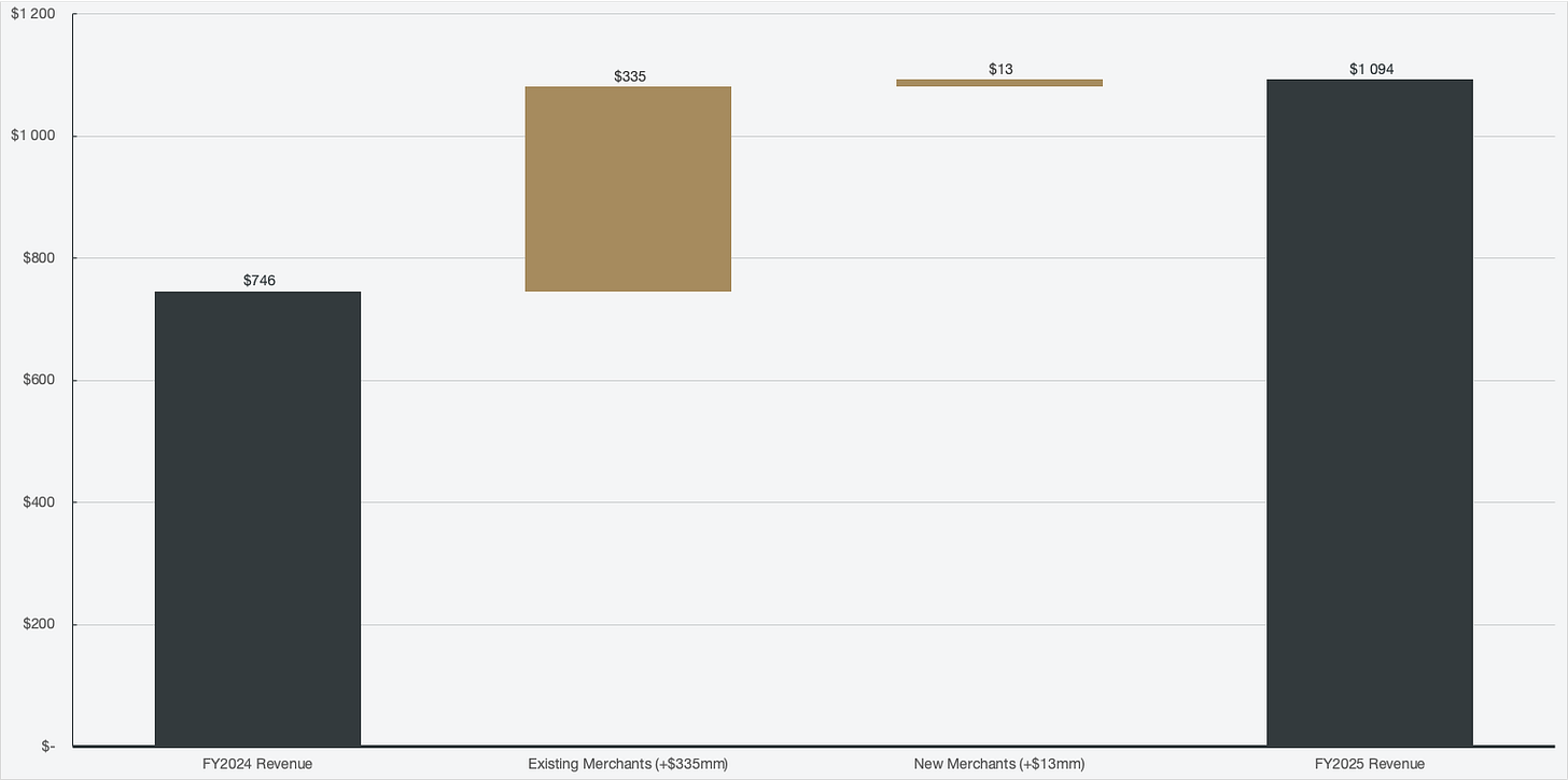 To get a sense of how important it is to nurture existing merchants and scale the relationship with them, we don’t need to look further than the revenue bridge between 2024 and 2025. 96% of the added revenue in the period was from existing merchants.
