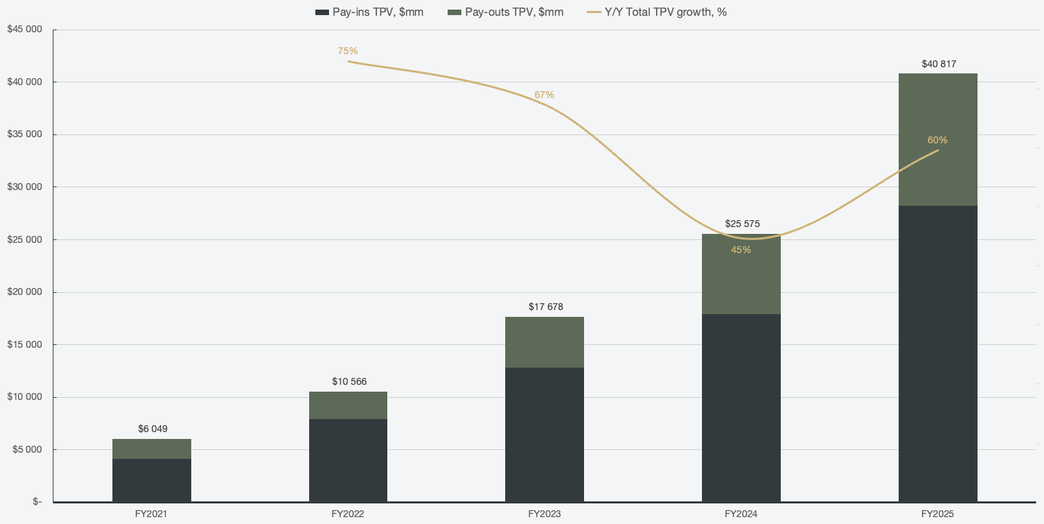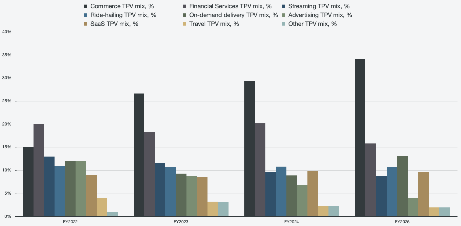 The payment volume itself is highly diversified across all parts of the economy, both across consumer categories and corporate categories. That means that TPV benefits from many parts of the economy growing in the EM’s, and the diversification means that there is less risk associated with the overall growth of the payment volumes. The only segment that has been actively growing its share across the TPV mix over the reportable periods is commerce, from 15% of overall TPV in 2022 to 34% in 2025.