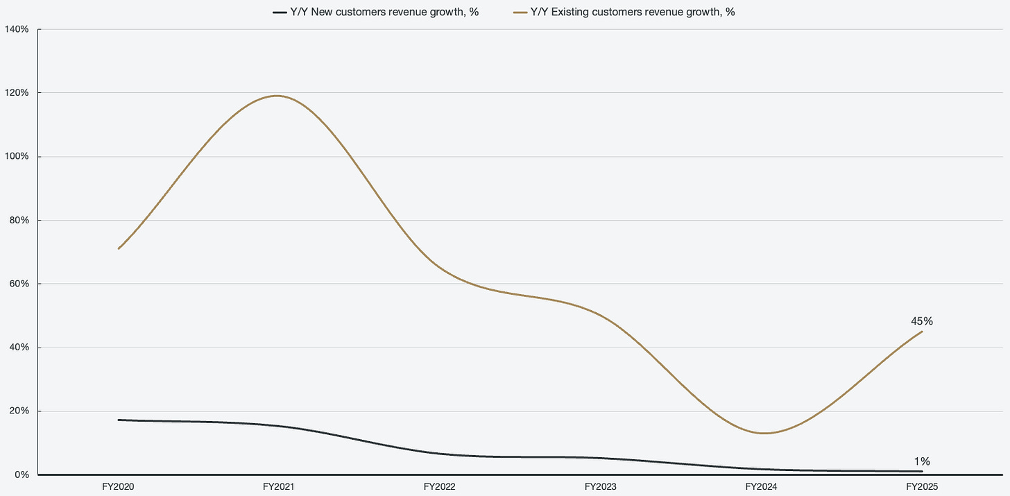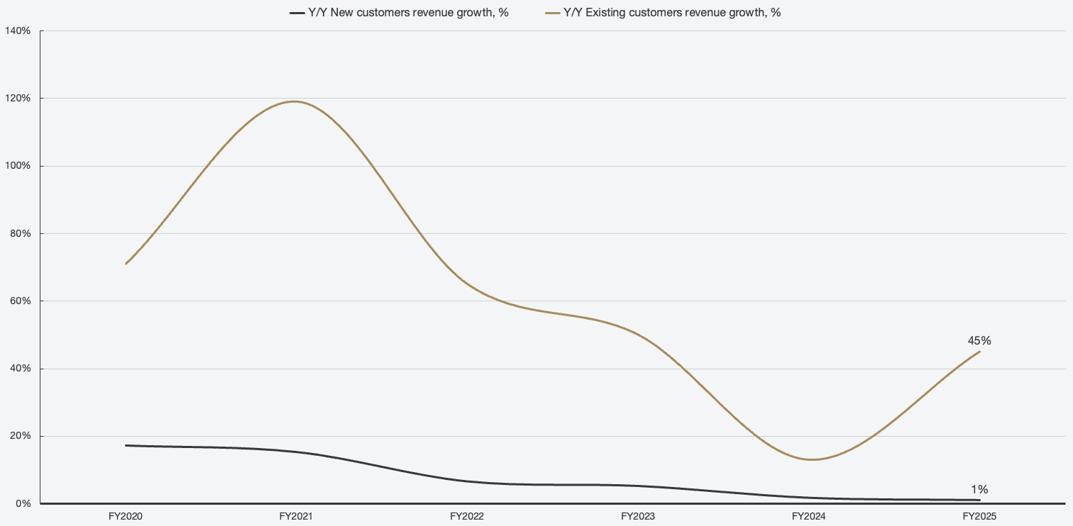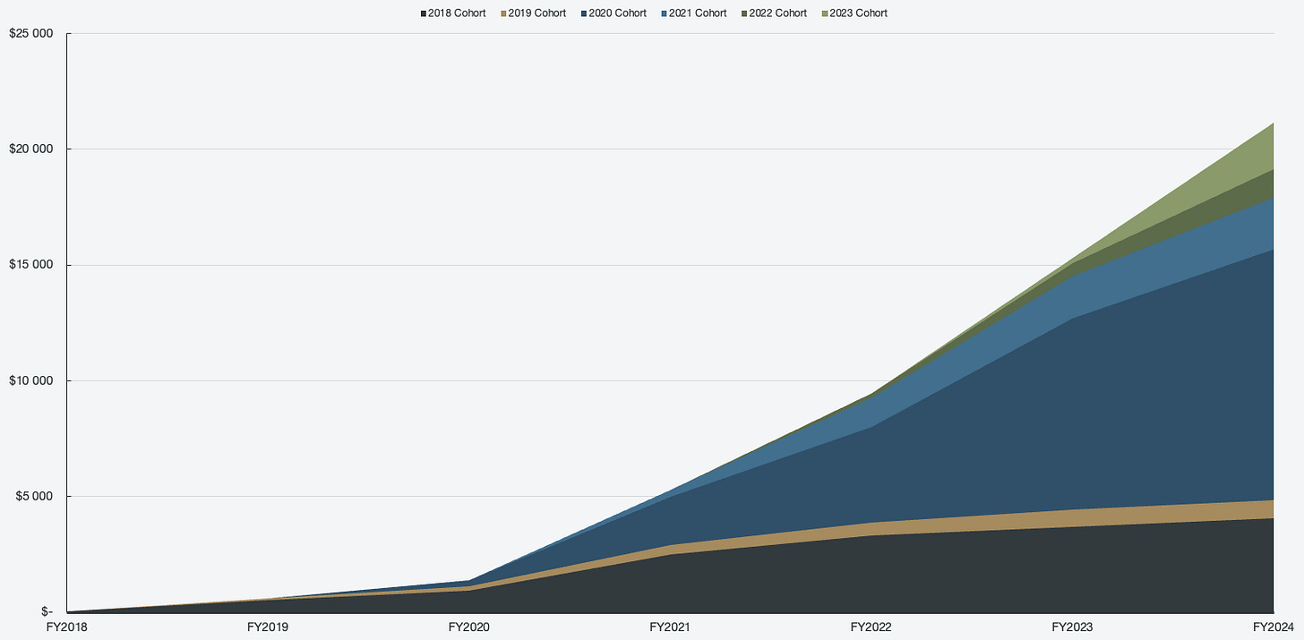 Looking at the net revenue retention over the past years, we can see that an overwhelming majority of growth is attributed to existing customers. By breaking it down into two cohorts of existing and new customers, the chart tells a clear picture of the importance of nurturing relationships with existing customers in order to drive growth for the business.