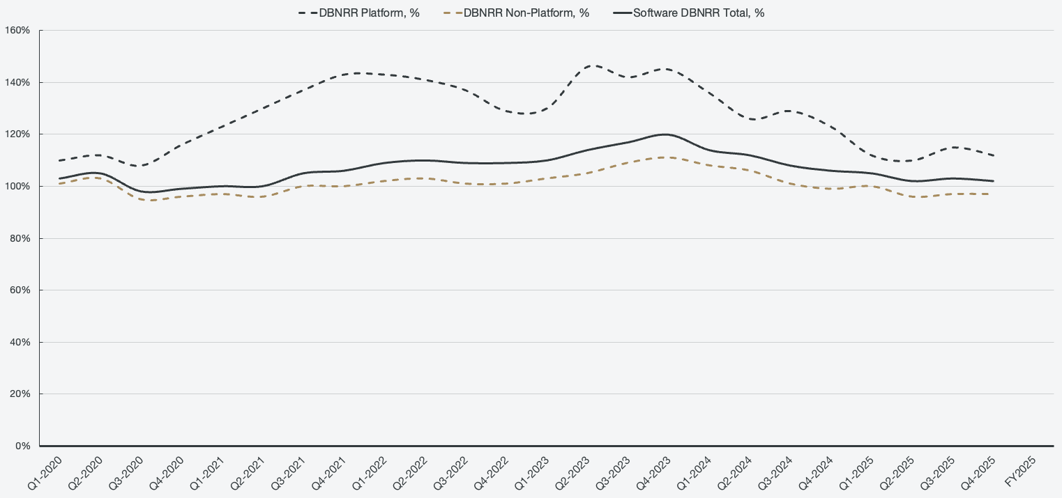 Since FICO uses a land-and-expand strategy (similar to Palantir), it is important to track net dollar retention. Dollar-based net retention rate (DBNRR) is the metric used to see how much ARR growth is attributed to existing customers. The goal is to get through the door and have companies deploy FICO software and then increase their spending and usage of the platform over time.