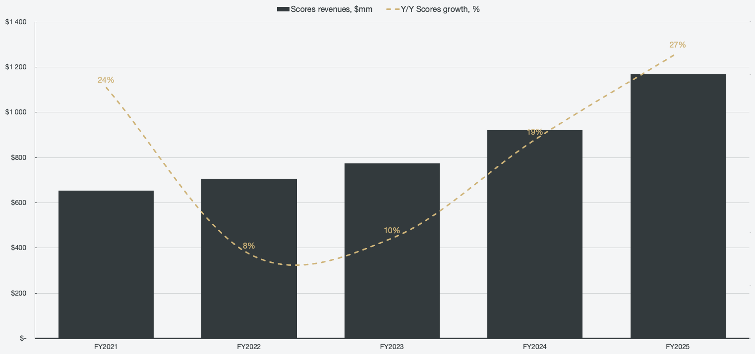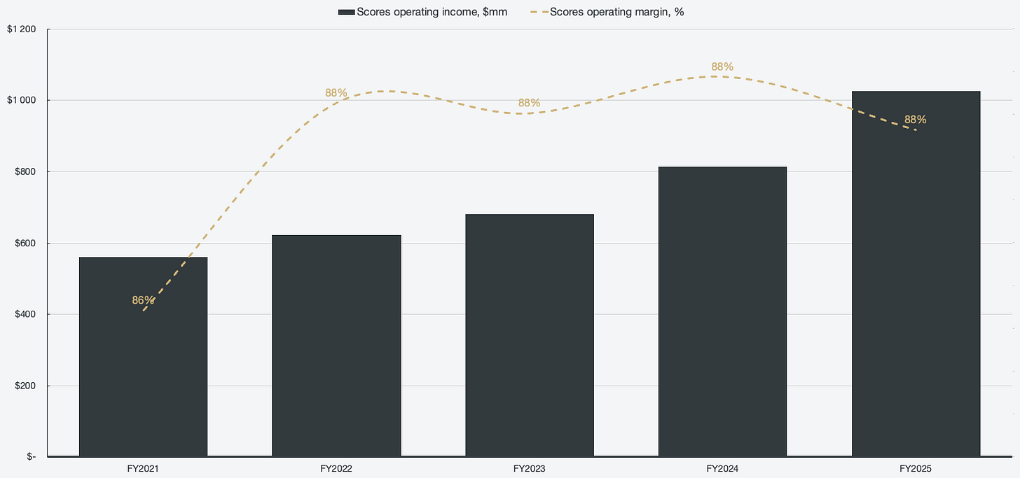 In the meantime, the current scores business model is still performing in a way that is expected of a compounding machine. The segment already has an outstanding margin profile of 88%, and the operating income is accelerating.