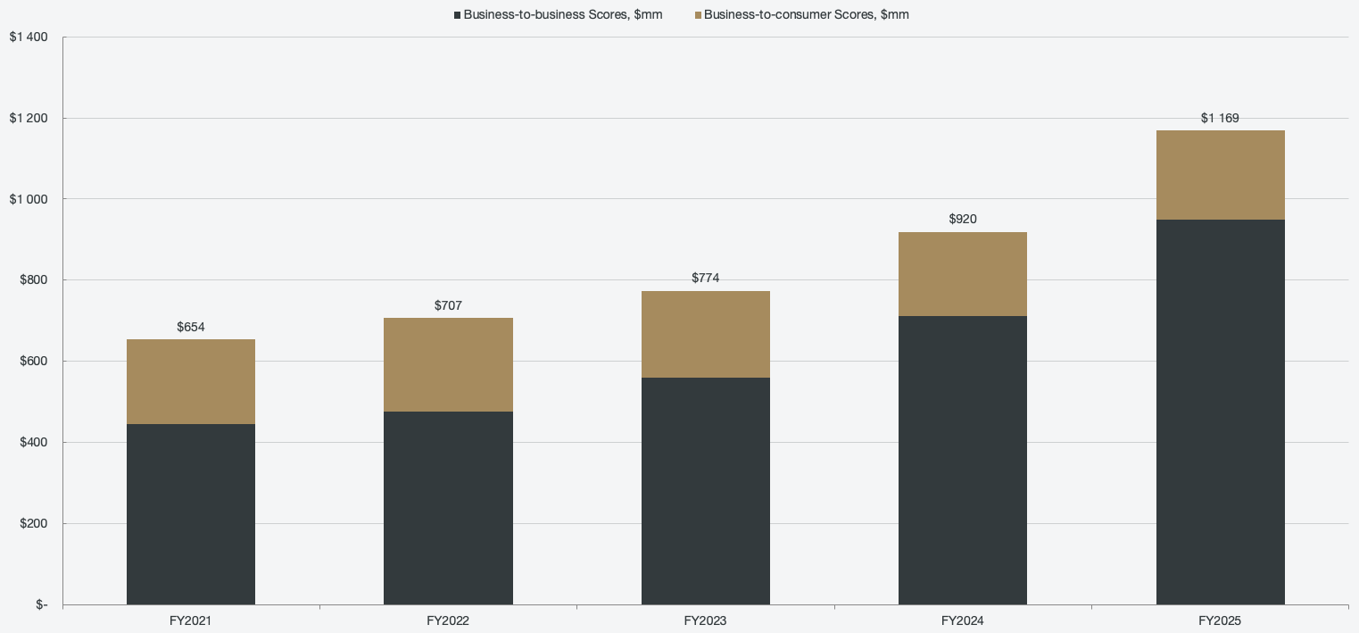 The primary driver of the scores revenue growth is the B2B segment, which has increased its part of the mix from a low of 68% in 2021 to now accounting for 81% of overall scores revenue in 2025. B2B, which serves banks, credit card issuers, insurers, retailers, and other various lenders and reporting agencies, grew 33% Y/Y. The B2C segment, which is primarily comprised of myFICO.com offerings, grew 6% Y/Y after declining in 2023 and 2024.