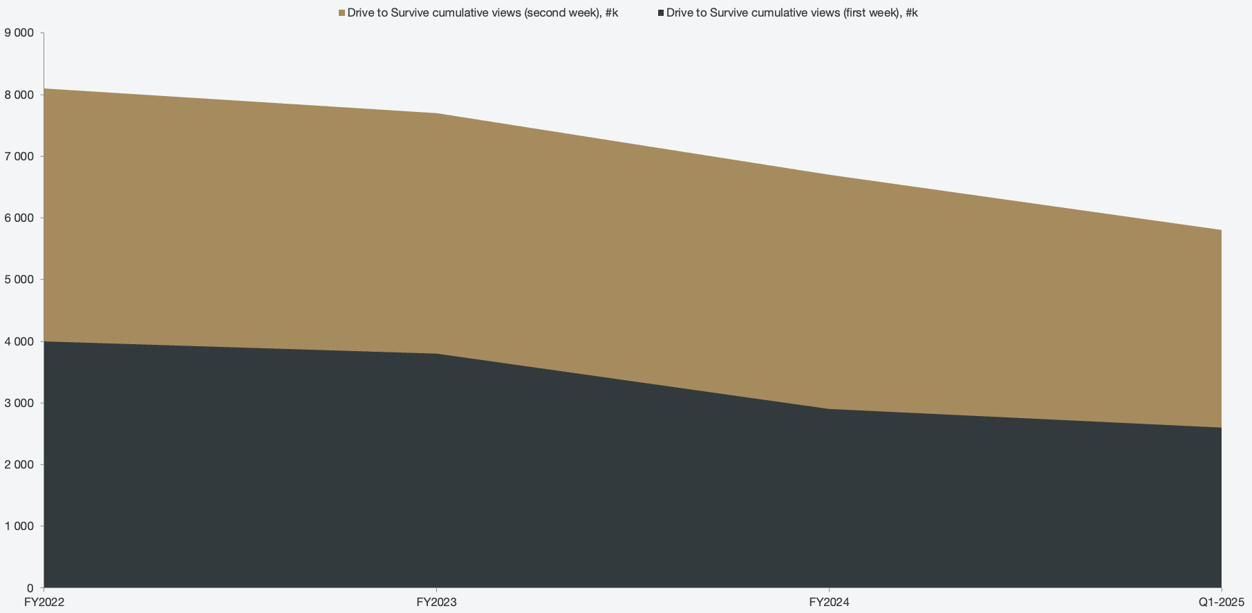 Figure 7: Drive to Survive cumulative weekly views (weeks 1, 2)