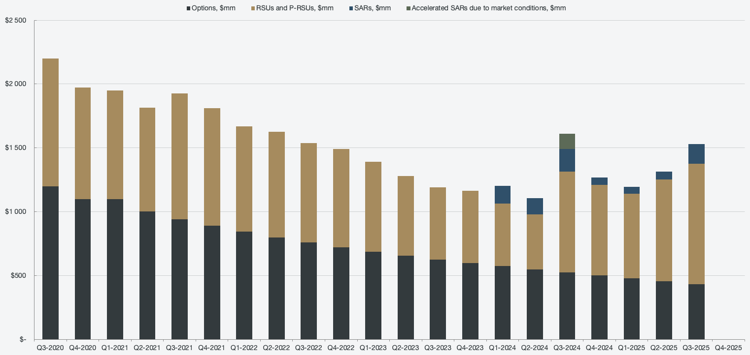 The option expense balance has been increasing, but it is not at a level where there is an implied 4% dilution rate each period over the next 15 years as Burry is forecasting. The 10K report is not out at the time of writing, which is why there are no Q4 2025 numbers.