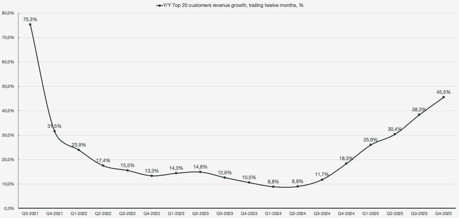 The actual dynamic unfolding is that the largest, most integrated customers are the ones elevating the NDR. 20 customers account for 42% of the business, and they are growing at 45% Y/Y on a TTM basis. The current NDR is 39%, meaning that the ones who are already paying the most are also the ones scaling faster than the average.