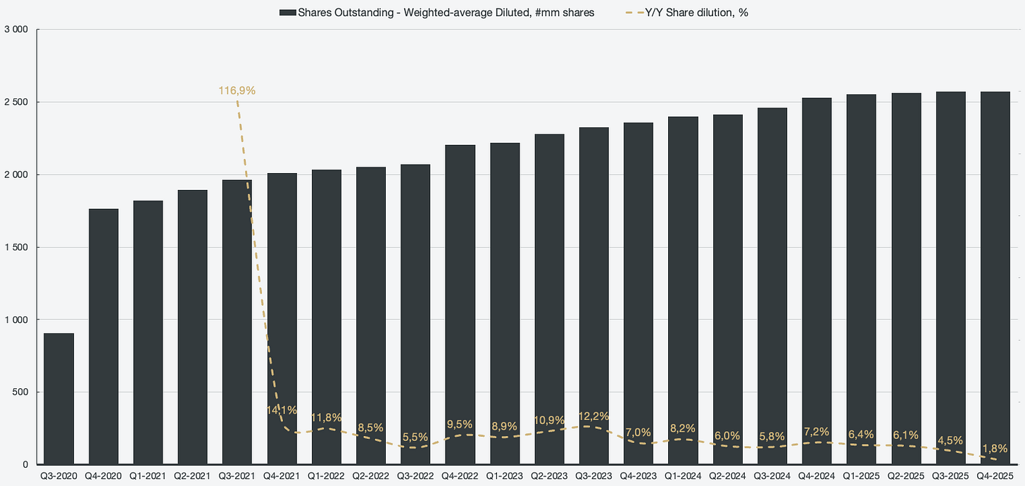 Michael Burry has modeled a 4% dilution rate for his intrinsic valuation. Actual Y/Y share dilution is down to 1.8%, and the trend indicates further decline. While Palantir has had high dilution rates historically, that is not the case currently.
