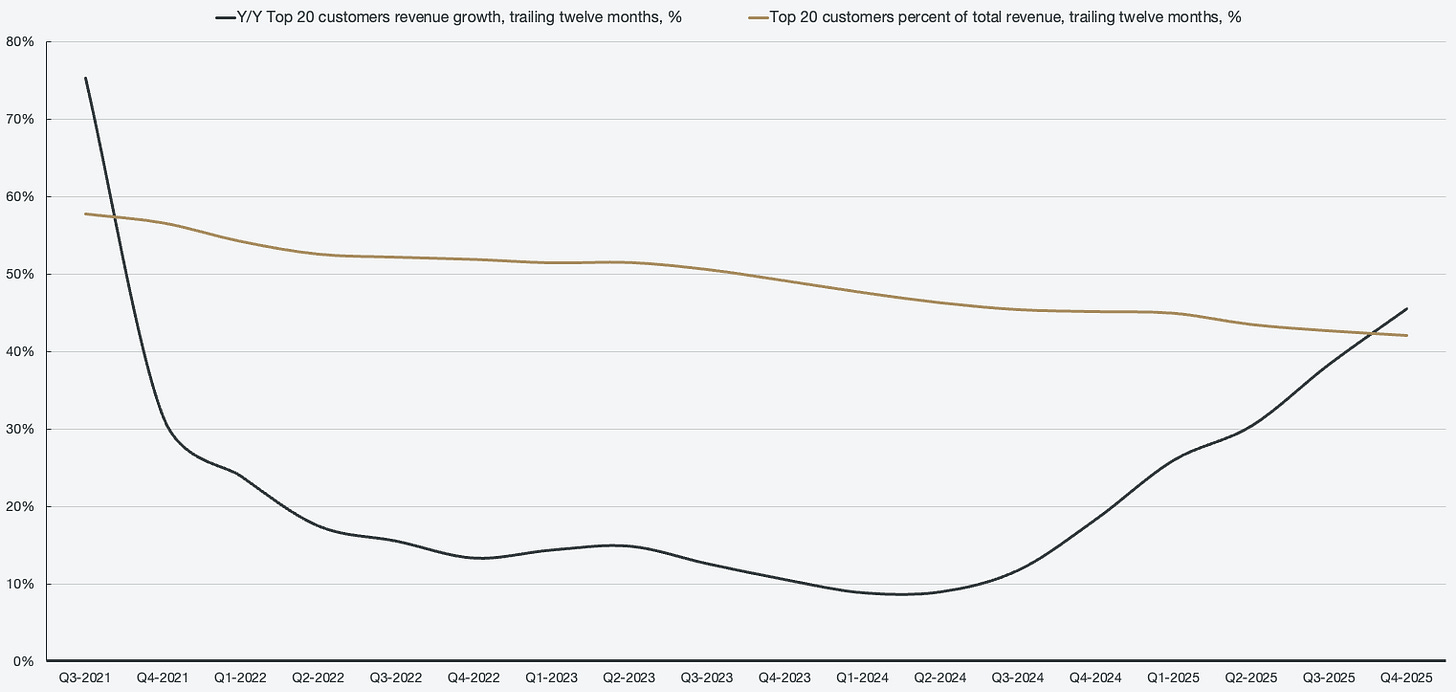 What makes Palantir special is not merely growing at an incredible pace, but the manner of how it is growing. I already covered the cohort growth dynamic, but it goes deeper, and for each stone turned, another positive surprise is discovered. Q4 2025 was a clear inflection point in what kind of customer contracts that Palantir is recognizing. In particular, the downward trend of average revenue per customer has flipped aggressively to the upside. The ARPC is calculated excluding the top 20 largest customers since they alone account for 42% of overall revenues and would heavily skew the calculation.