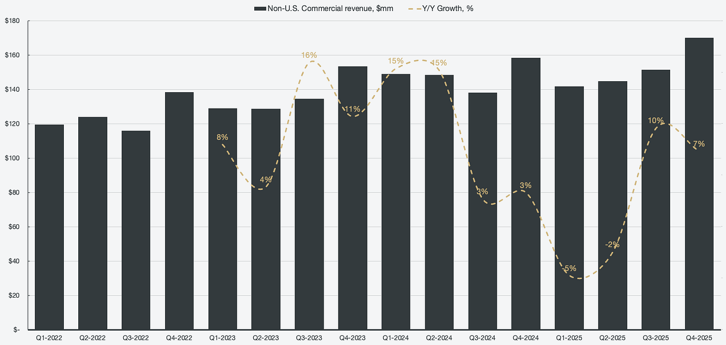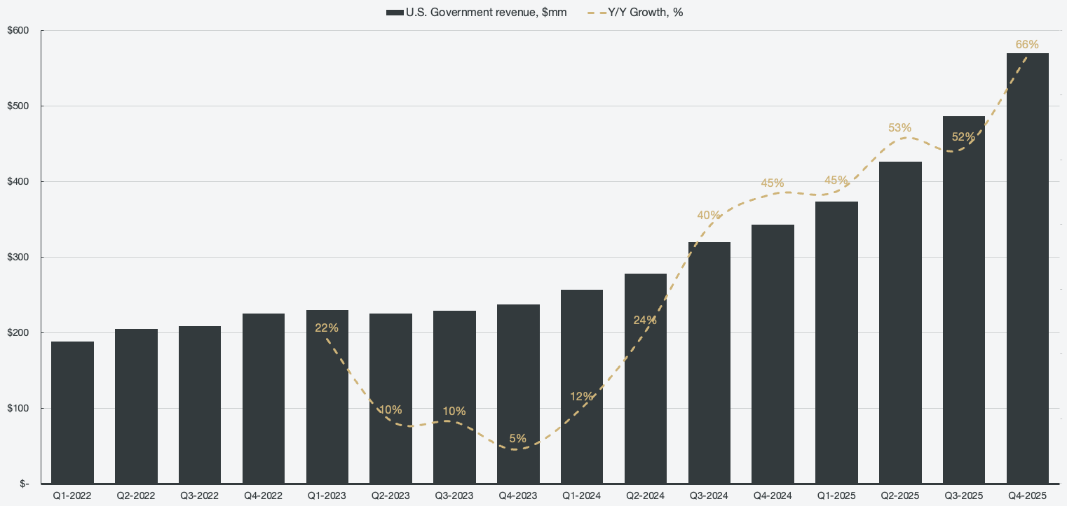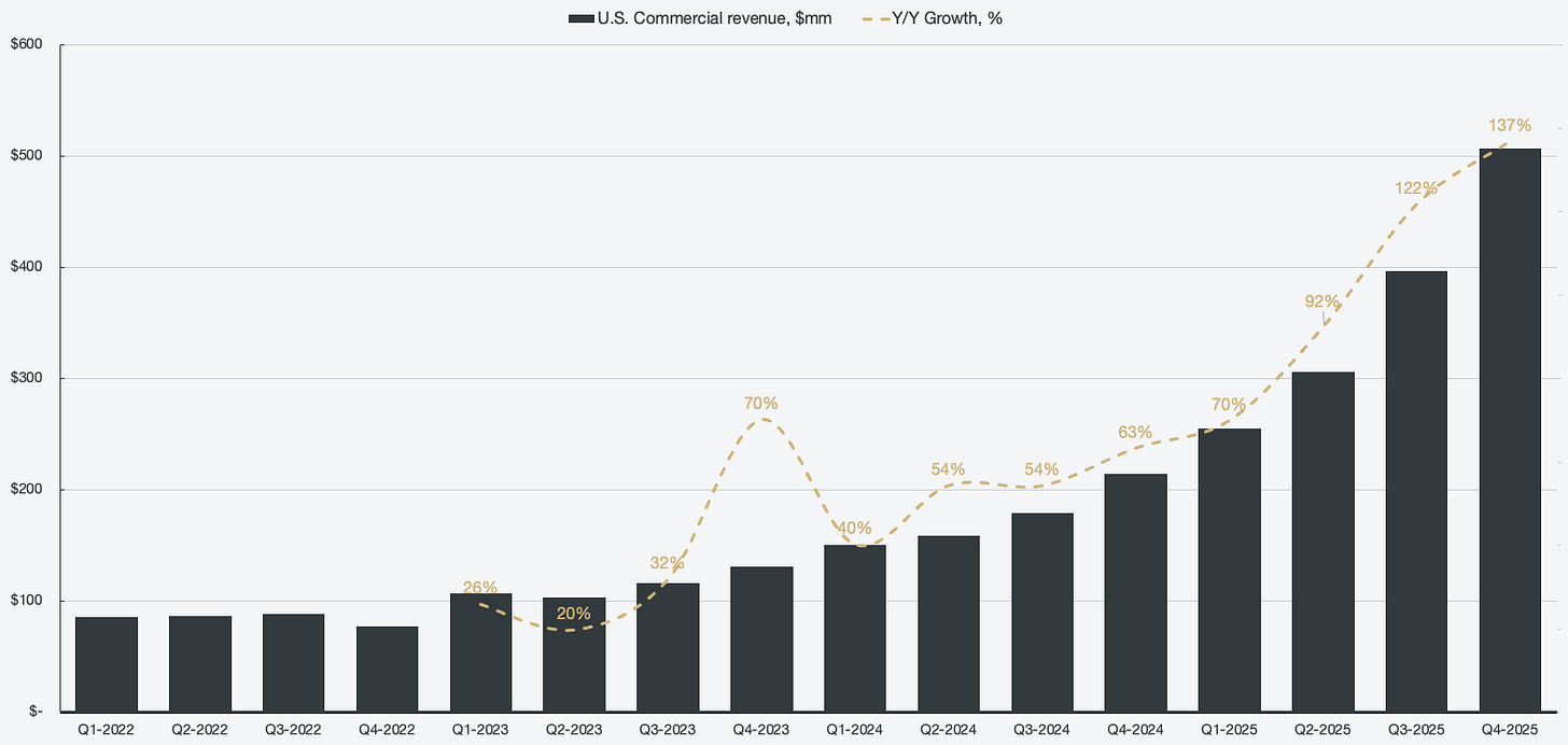 On a segmented basis, U.S. Commercial is the crown jewel in terms of growth and the primary beneficiary of AIP. For 2025, U.S. Commercial grew 109%, and Palantir has guided the segment to grow at least another 115% in 2026. For Q4, U.S. Commercial grew a staggering 137%, eclipsing 122% of the prior quarter.