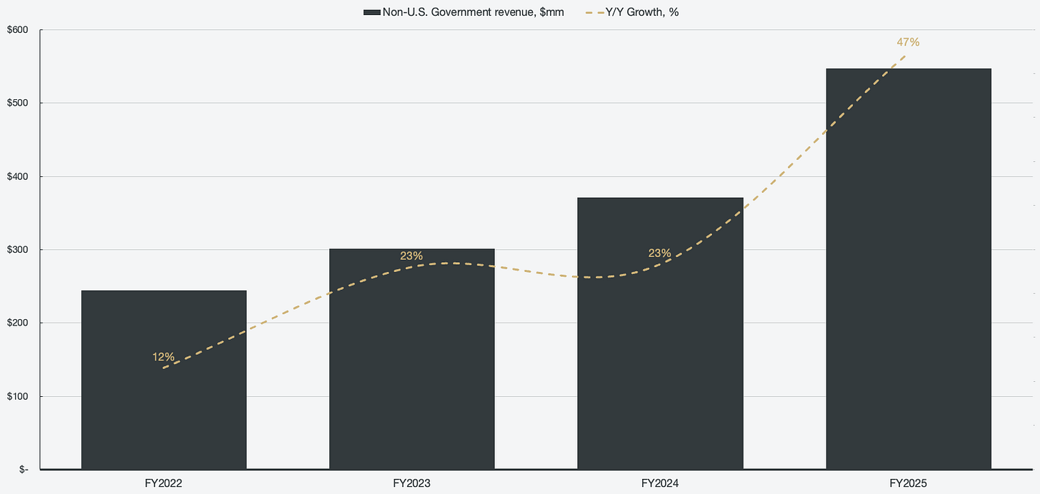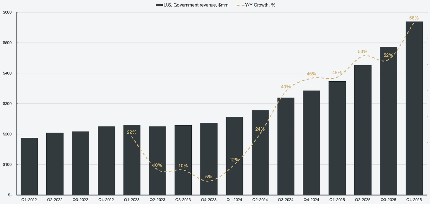 While the commercial end is struggling outside of the U.S. borders, the non-U.S. governments seem to have understood that they need Palantir. Y/Y growth more than doubled in 2025 compared to 2024, and similarly to the rest of Palantir’s business, this segment is also just getting started.