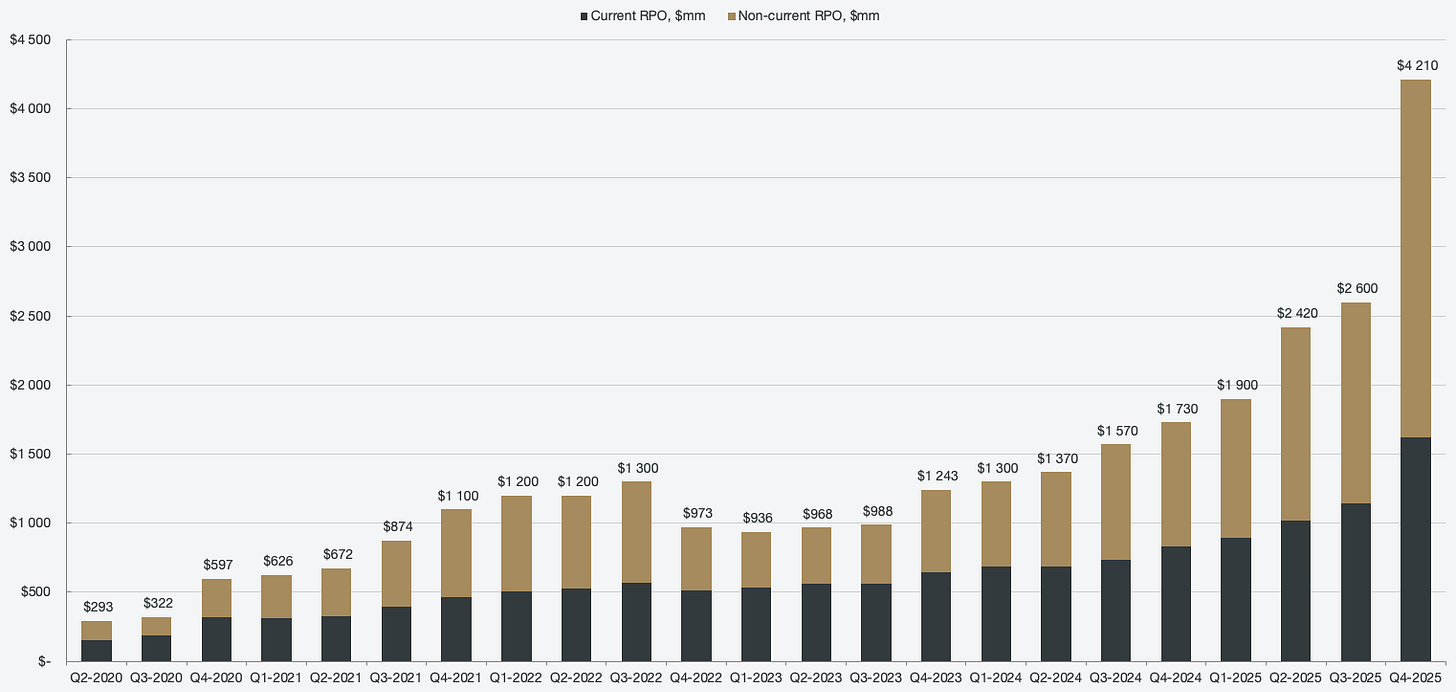 The guidance provided by Palantir for 2026 is strong, but I believe it is on the conservative side. Looking at remaining performance obligations, which essentially are a proxy for guaranteed commercial revenue to be recognized, there is $1.62 billion to be recognized over the next twelve months already. That is guaranteed revenue, with another $2.6 billion to be recognized over the long term. The reason RPO specifically ties to the commercial business is because many government contract types lack fixed terms, and as such, can’t be recorded as RPO. The RPO growth for the quarter is also in the triple digits, growing 143% Y/Y.