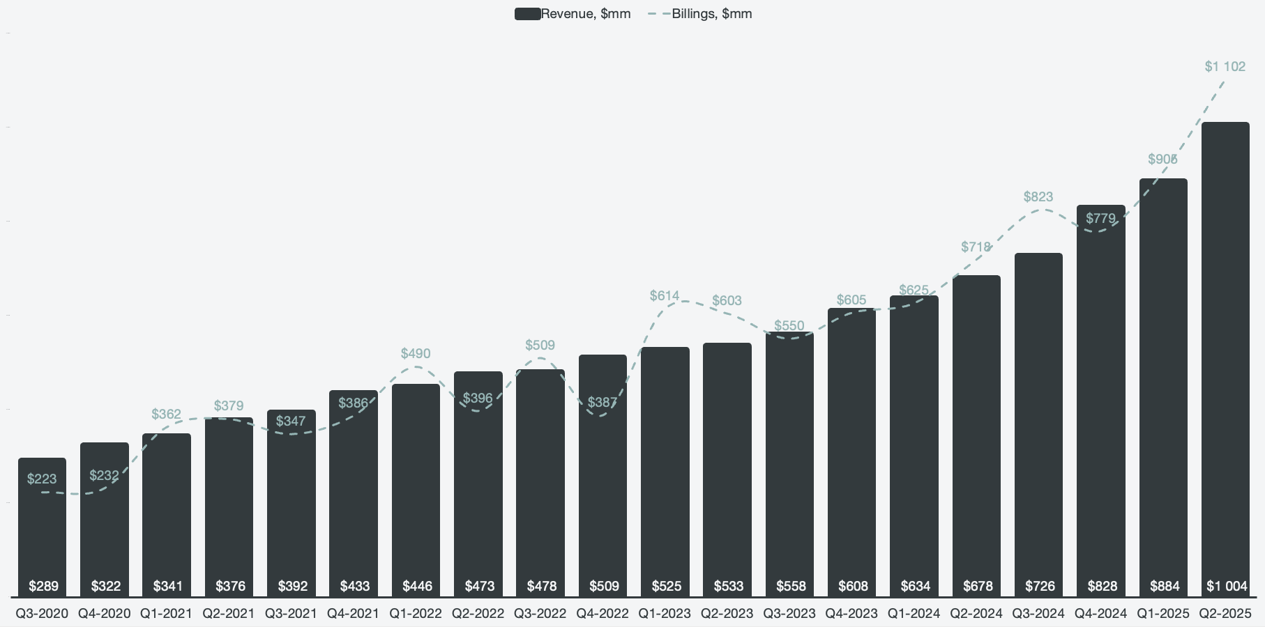 Billings, too, reached an all-time high and gapped actual revenue by ~$100 million.