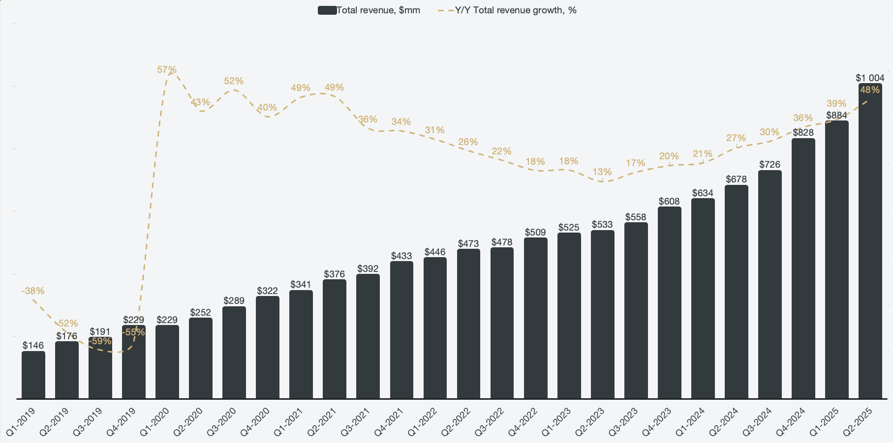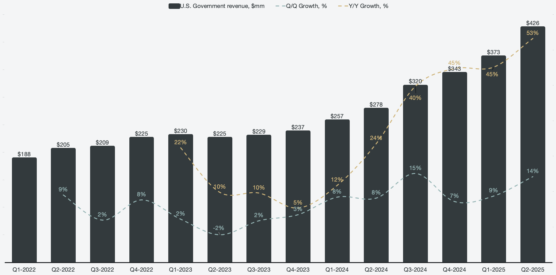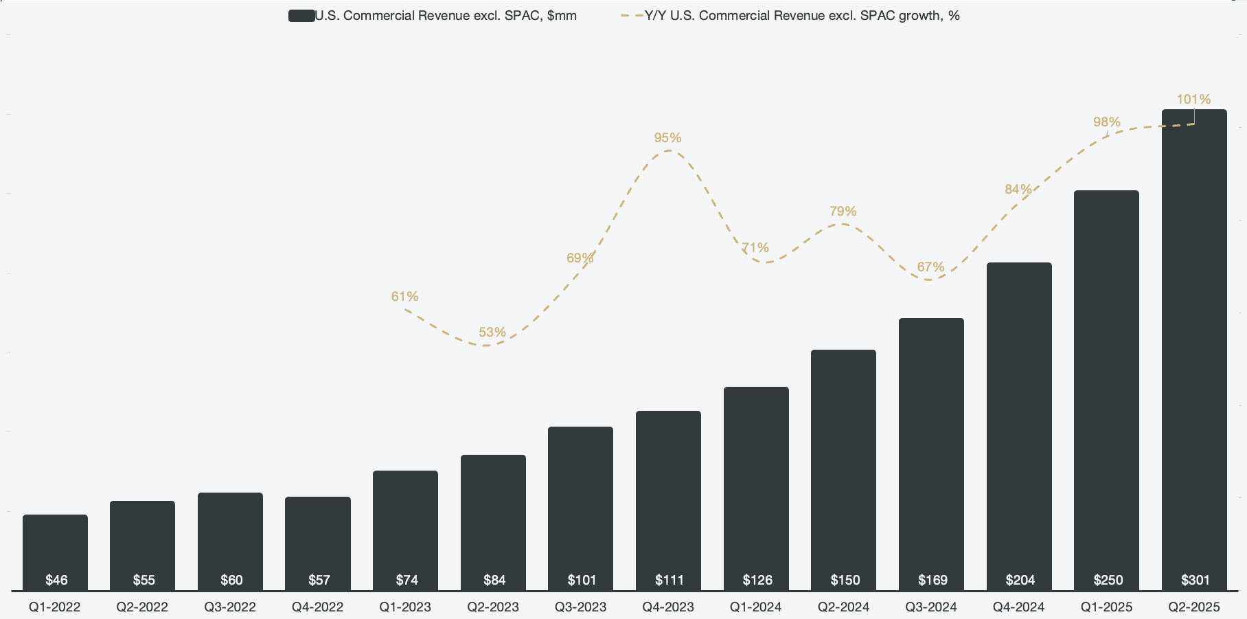 The primary beneficiary of the AIP scale-out is currently the U.S. commercial business, which grew a staggering 92% Y/Y. However, when only looking at organic growth (excluding SPACs), U.S. commercial revenue growth crossed triple digits and grew 101% in Q2.