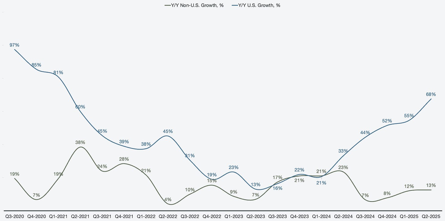 If Palantir were merely serving the U.S., revenue growth would have been 68% Y/Y for the quarter. However, Palantir has a drag on its overall revenue results, and that is all primarily Europe. Non-U.S. commercial growth has been non-existent for years. Non-U.S. governments do see some growth, but the rate is incomparable to the U.S. counterpart recently. However, a reacceleration is occurring on the non-U.S. government side, and it has outgrown the U.S. government over the past three years (119% non-U.S. growth vs. 108% for the U.S. government since Q2 2022). The impressive part is that Palantir is about to grow 50% Y/Y in Q3 2025, with a third of its business only growing a modest 13%.