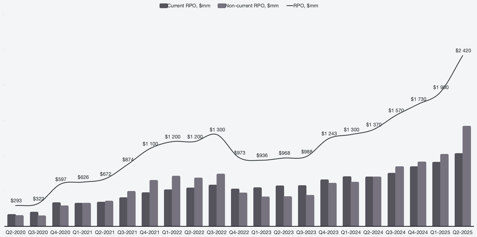 The full dollar amount outlined in the RDV is not guaranteed to be recognized, as it contains options in the contracts that may not be exercised. Remaining performance obligations (RPO), on the other hand, are guaranteed revenue. The caveat is that RPO excludes most government revenue due to the contracts often not having fixed timing and amount of dollar recognition. Therefore, RPO serves as a good glimpse at, and proxy of, the commercial segment specifically. Similarly here, there is a new all-time high hit at $2.42 billion, and it marks two years of consecutive quarterly increases.