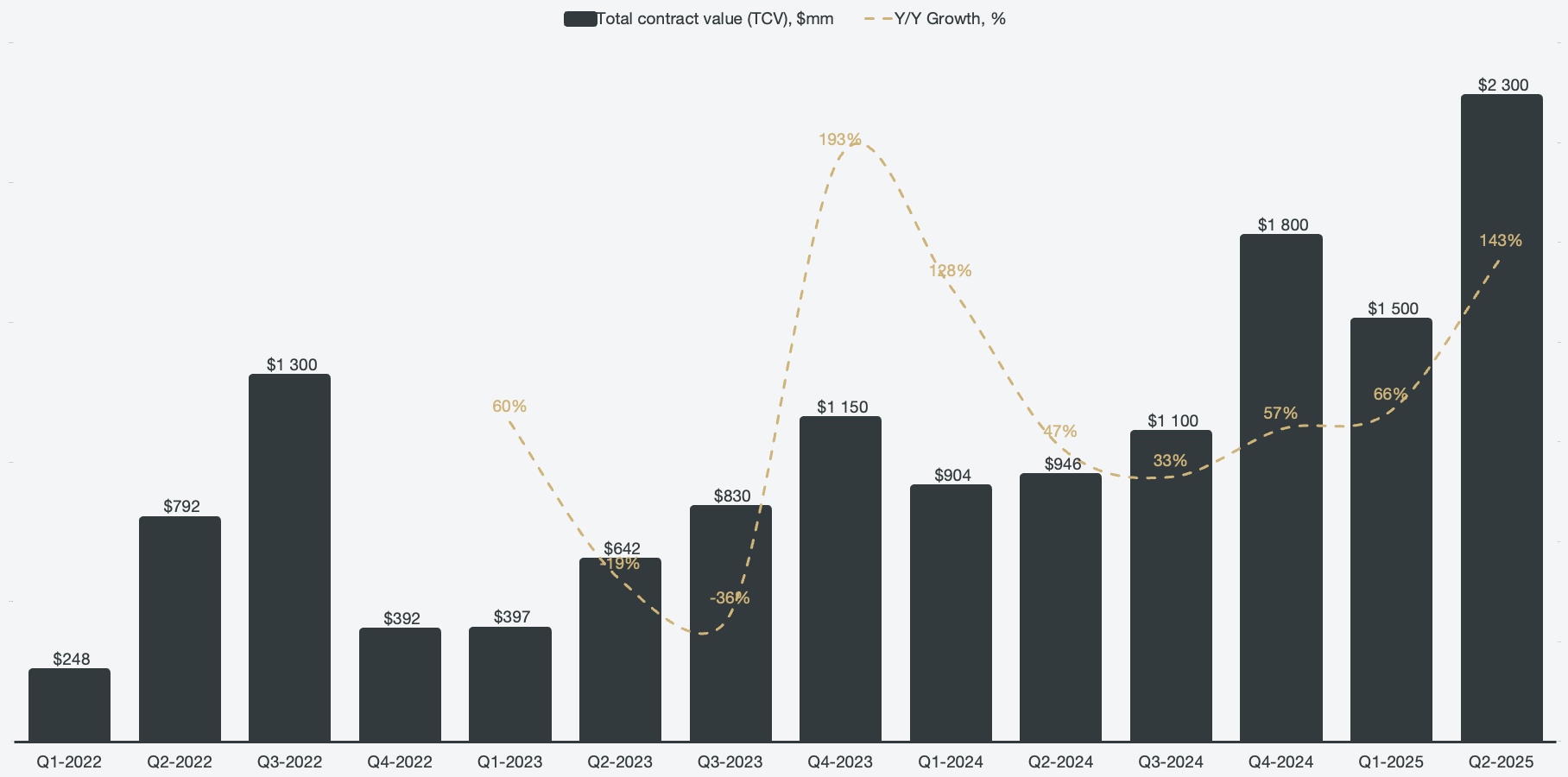In addition to looking at how current cohorts are scaling, investors can also get a hint of future growth by looking at contract balances. Total contract value, which outlines the total aggregated value of deals closed during the quarter, hit an all-time high in Q2 and grew 143% to reach $2.3 billion.