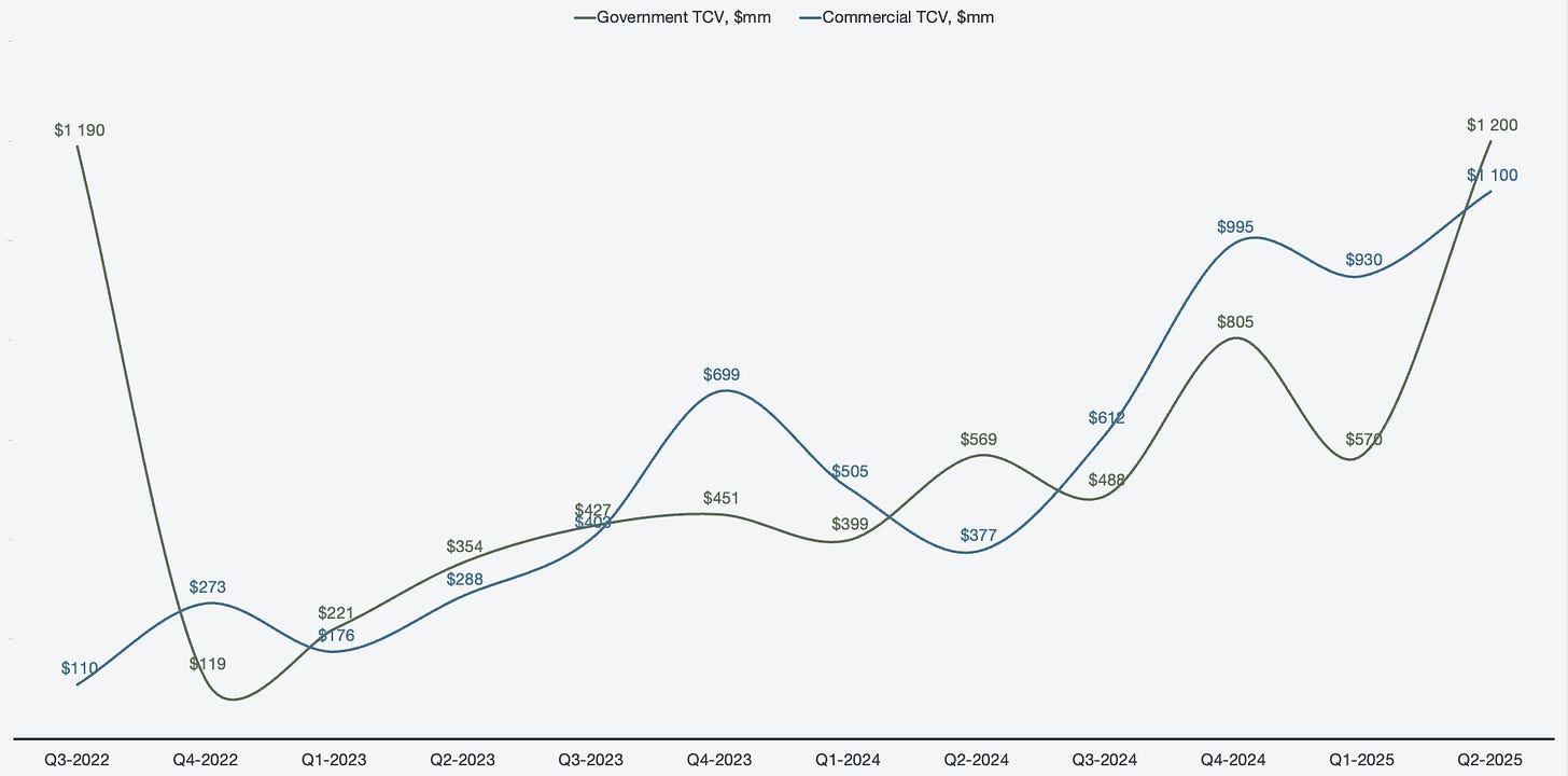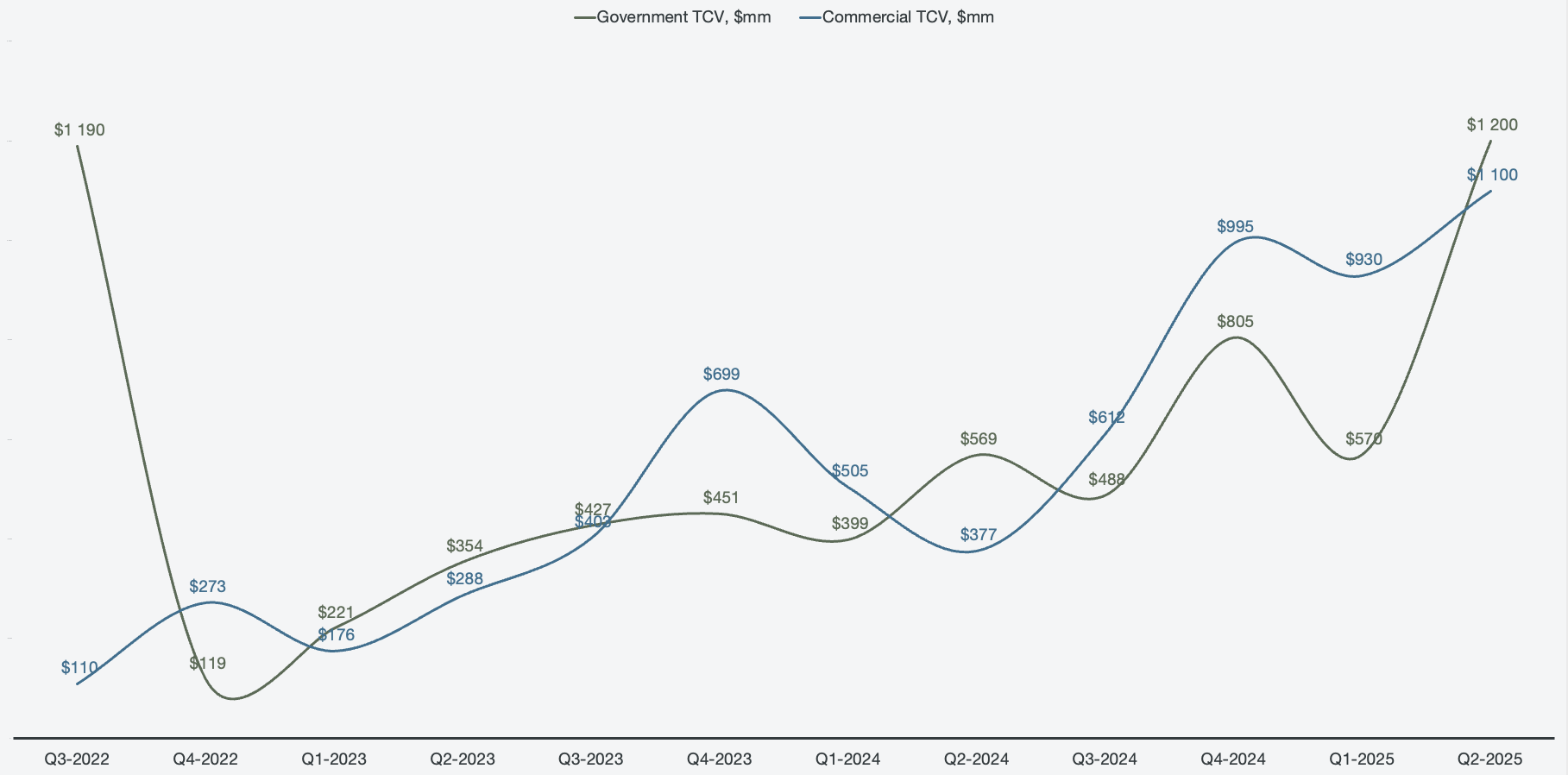 When reviewing the composition of TCV, we can see that both the government and commercial segments are contributing meaningfully, which is what we expect to see. If there was an imbalance, it would have suggested that one half of the business was being left behind. Government is in general more lumpy by nature of procurement, but there is stability in the upwards trend over the past three years.