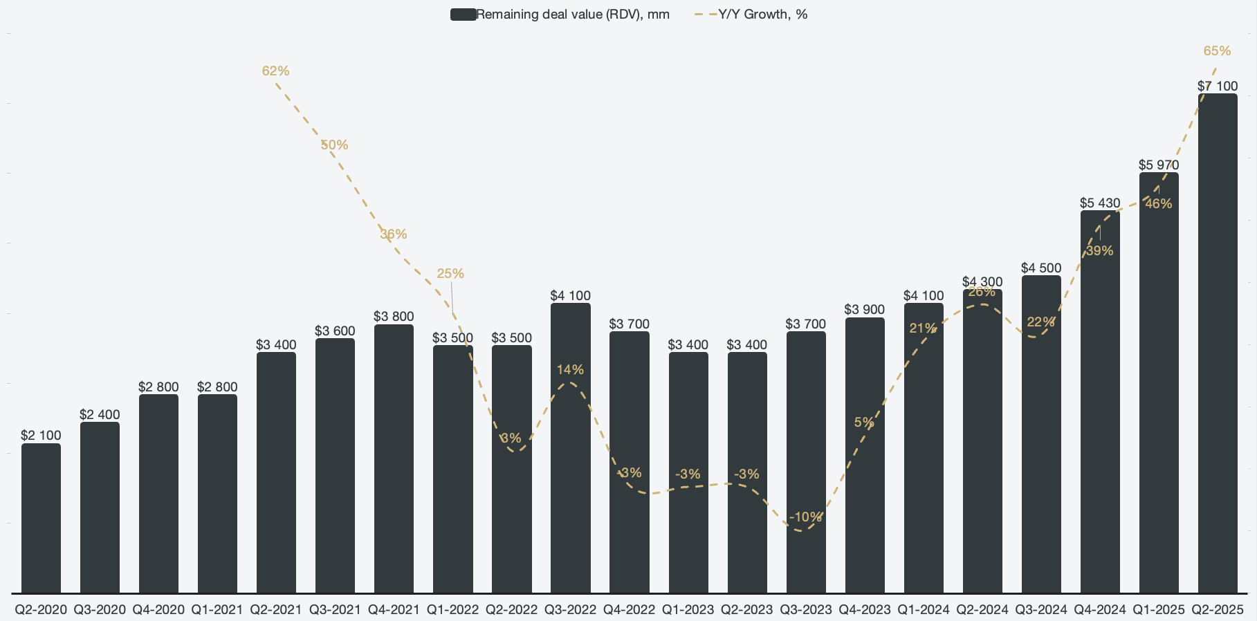 Similarly, remaining deal value, which outlines the total outstanding deal value that Palantir is yet to collect (including options, which are not guaranteed), also hit a new all-time high at $7.1 billion, growing 65% Y/Y.
