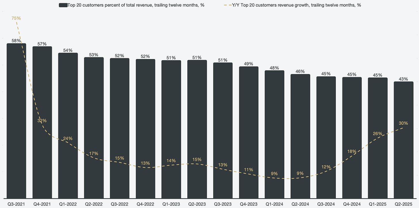 Figure 8: Top 20 customers’ percent of overall revenues and growth, TTM
