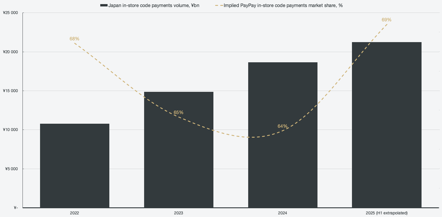 The PayPay usage rate translates to an even higher overall market share of the primary service, which is code-based in-store payments. Over the past four years, of the ¥64.56 trillion in-store QR code payments volume, around 67% was paid through PayPay. Calculated using the following formula: