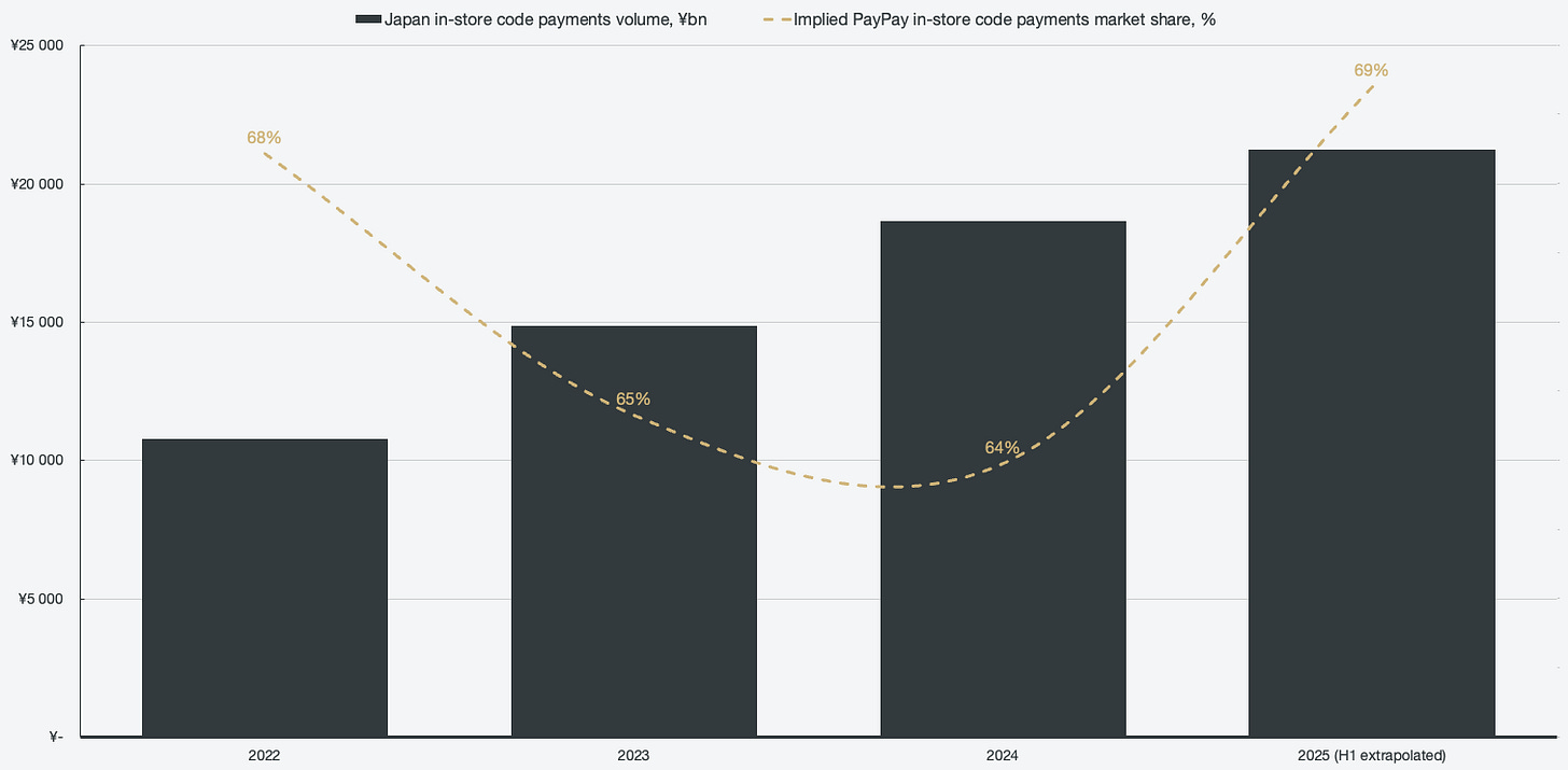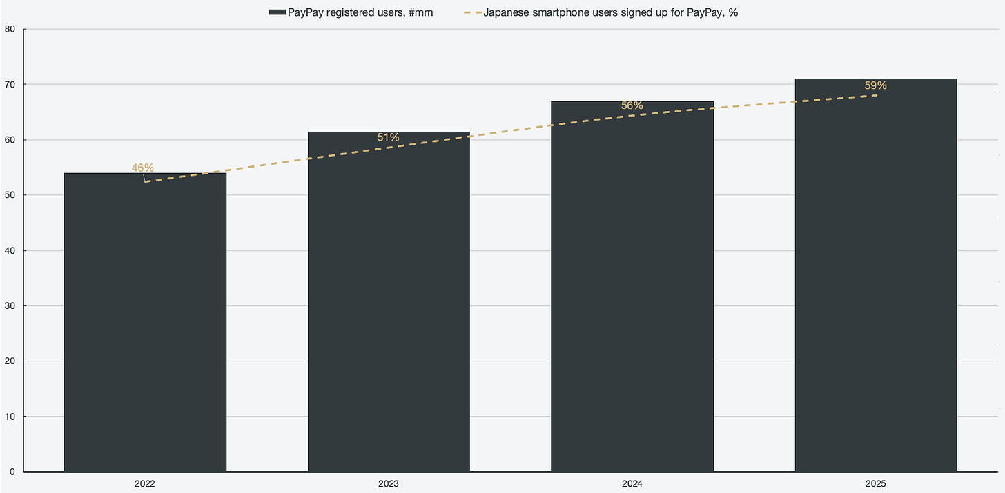 Depending on which third-party estimates of Japan’s smartphone penetration you use, about two-thirds of all Japanese smartphone users are registered for a PayPay account. In the most optimistic assumption, implying that 98% of all Japanese use a smartphone in 2025, PayPay has a ~60% registry rate. A rate that is still trending upwards aggressively.