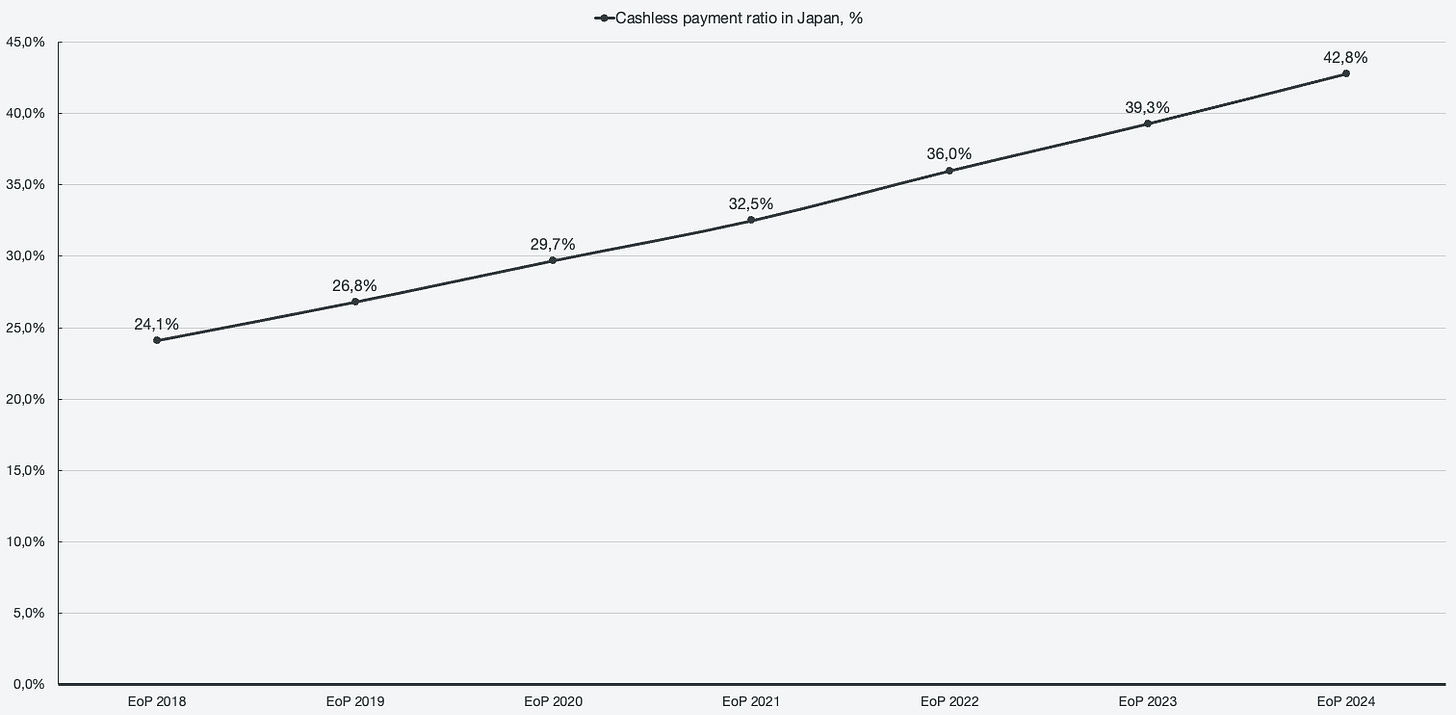 As a stark contrast to the cashless adoption, Japan has the highest smartphone penetration rate globally of adults under 50 (~100%). That is an impressive feat, considering how late Japan was to adopt smartphones, as they relied on an advanced ecosystem of domestic feature phones (flip phones) that already had features such as mobile TV, internet, email, and digital wallets. All that was needed to start the cashless revolution was a catalyst and someone to capitalize on the opportunity. The catalyst was the Japanese government, and the company to take advantage of the opportunity was PayPay. The 2025 goal of reaching 40% cashless, laid out by the Japanese government, was effectively reached by the end of 2023.