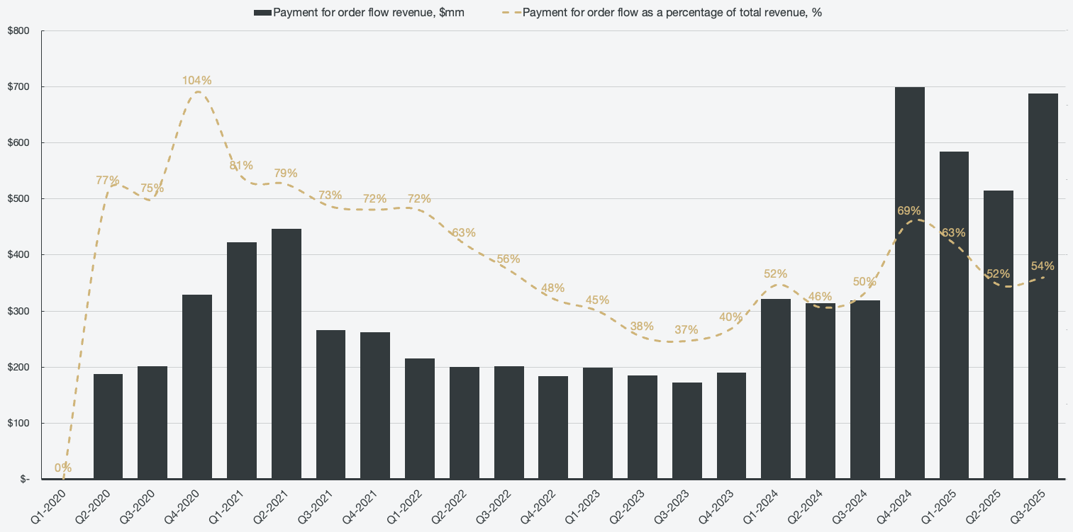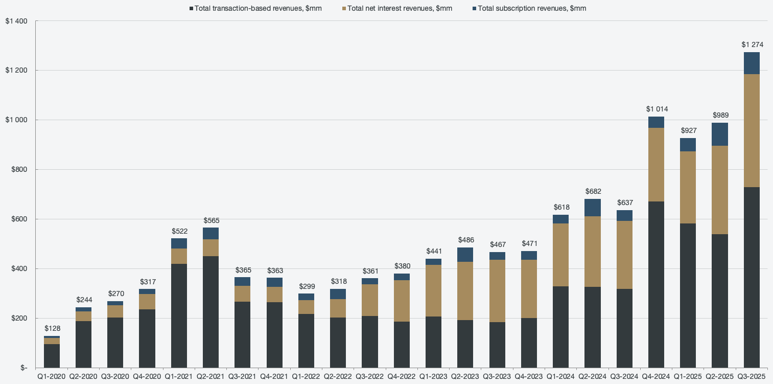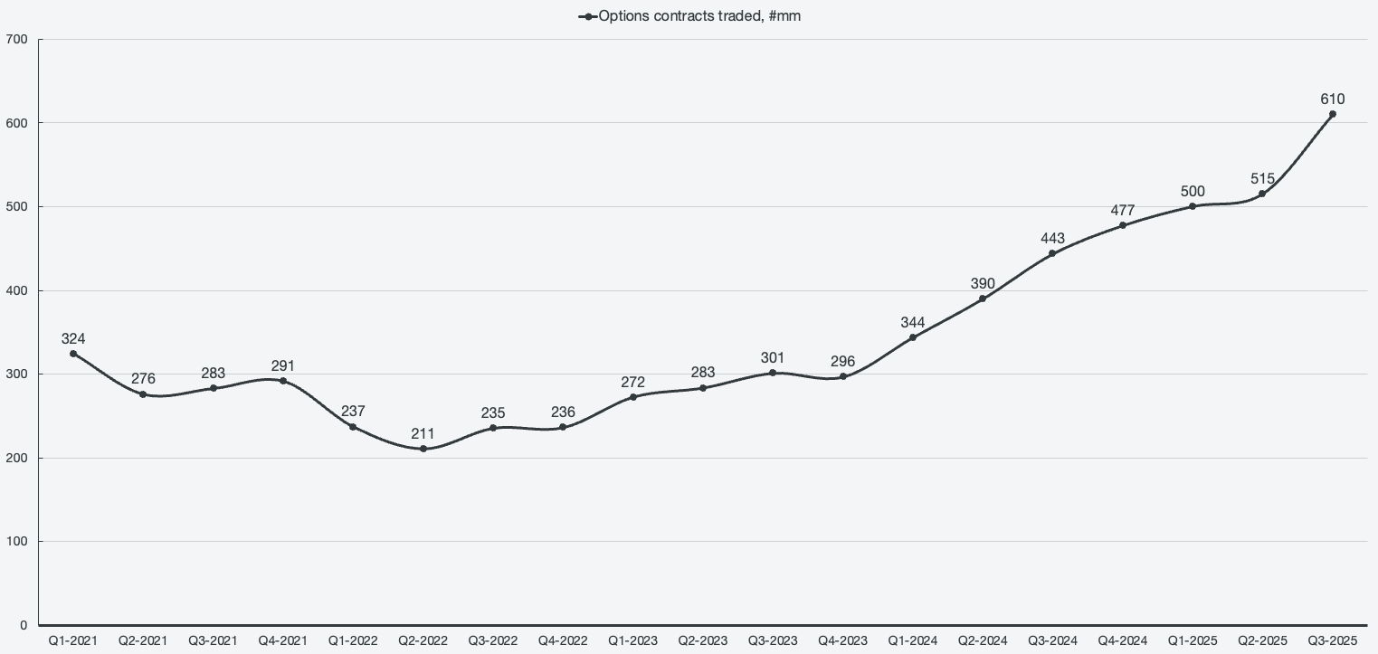 The main revenue driver continues to be options trading, and similarly to other segments, options are accelerating. During Q3 2025, options revenue reached an all-time high of $304 million, representing ~50% Y/Y growth. The total amount of options contracts traded also reached an ATH of 610 million contracts, and the trend is accelerating.