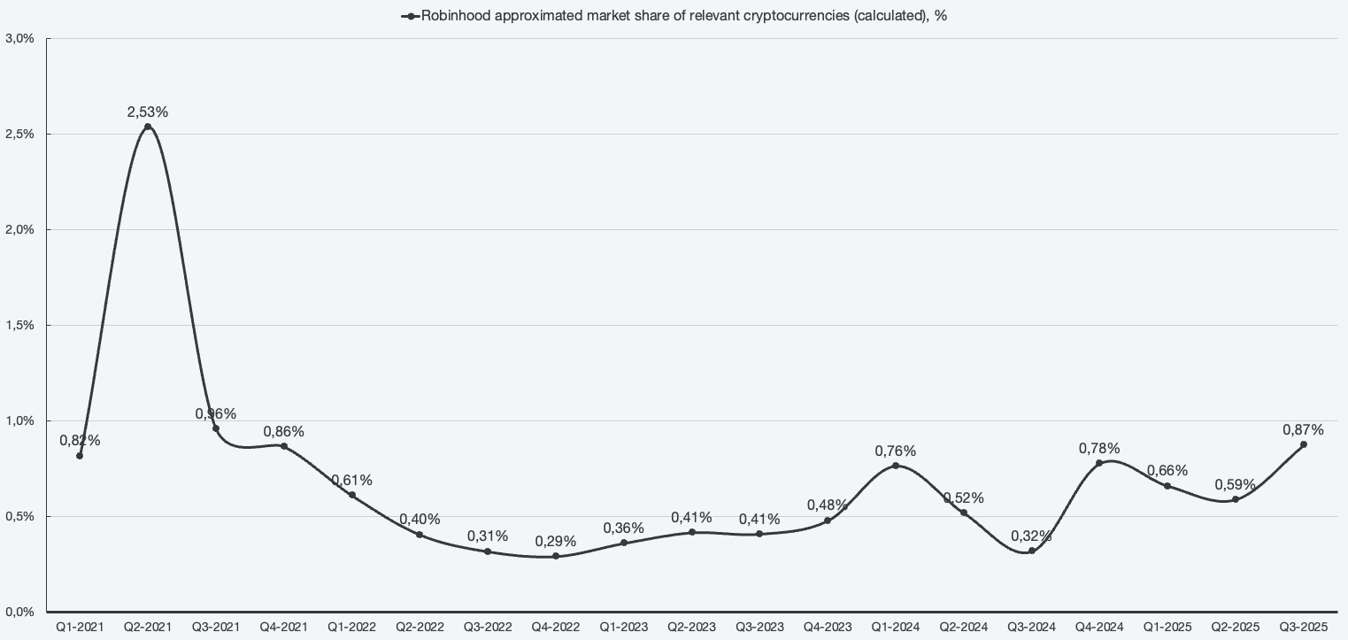 Overall, Robinhood is gaining market share in the cryptocurrency space. I calculate an approximated market share by comparing Robinhood’s crypto volumes against the total volume of relevant cryptocurrencies (Bitcoin, Ethereum, and Dogecoin). By this measure, the overall approximated market share is 0.87%. However, in their Q3 earnings presentation, Robinhood presented a 1.08% calculated market share of the cryptocurrency markets, defined as follows: