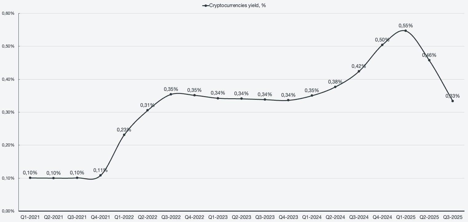 Cryptocurrencies and options are not as mature and still present attractive spreads for market makers. The yields are significantly higher compared to equities, where on average, a Robinhood user has to spend ~3x the amount of money trading equities in order to equal one cryptocurrency trade. That used to be ~5x, but since the acquisition of Bitstamp, it has been trending lower as well. The options yield has stayed relatively stable at 50% in Q3 2025, compared to 51% the quarter prior.