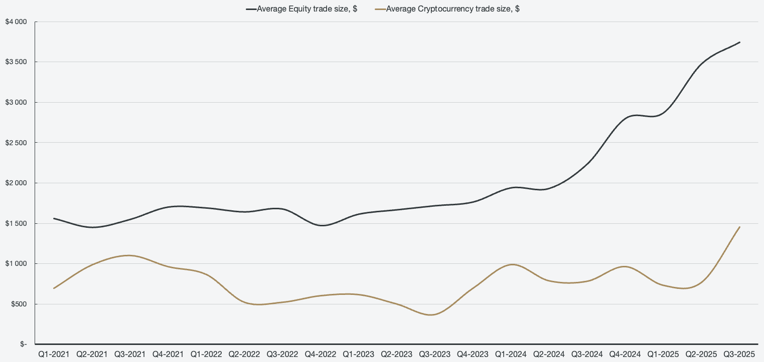 The increases in market share are primarily driven by trade sizes increasing substantially and showing a positive upwards trend. The average equity trade size is ~$3750, while the average cryptocurrency trade size is ~$1500. That represents: