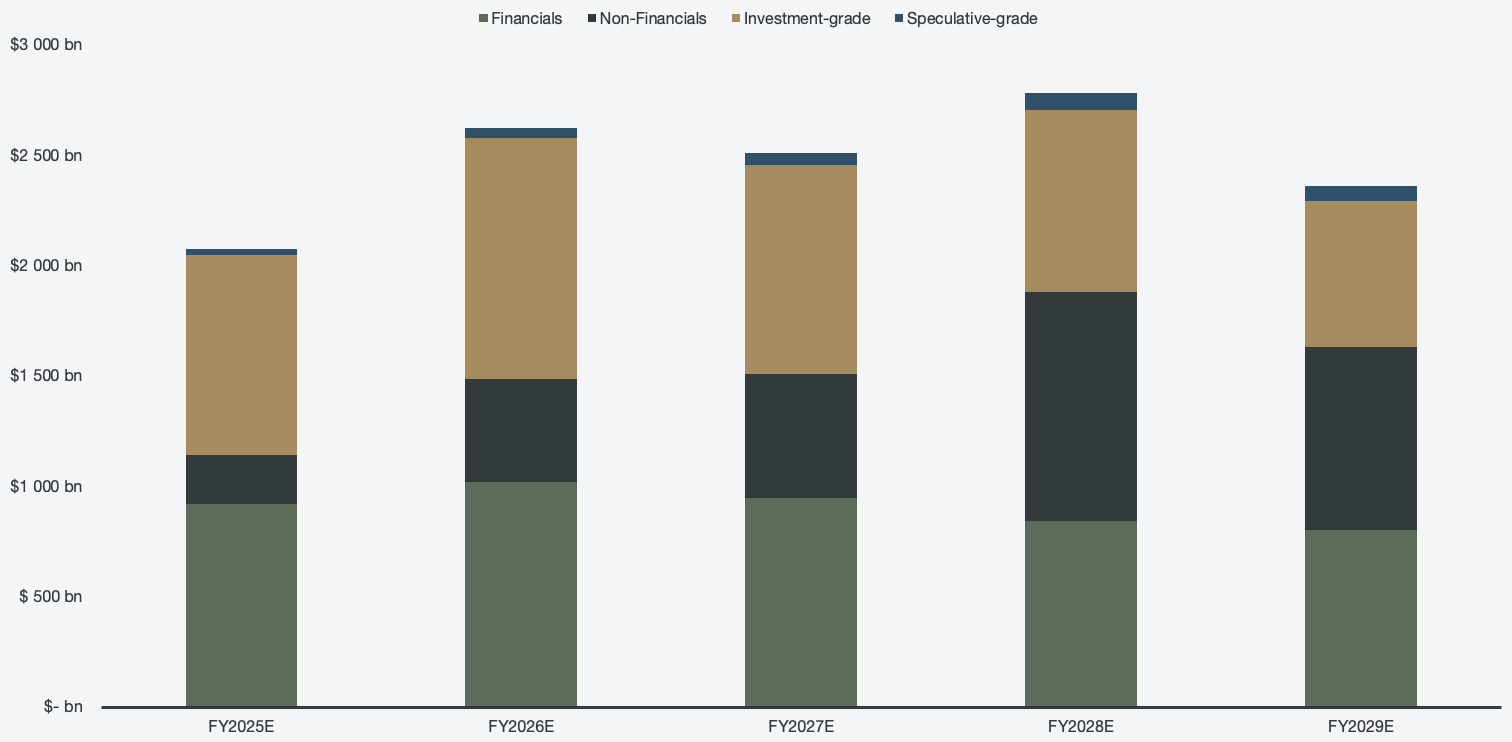 2022 saw a harsh pandemic-related spike in the 10-year U.S. Treasury yield, going from ~1% at the beginning of the year to a peak of above 4%. Due to this, refinancing of debt and new credit issuances were substantially less attractive. However, issued debt has a maturity date, and by tracking the maturity schedule, the ratings business becomes a lot more predictable.